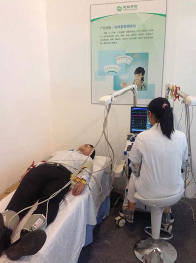 慈銘體檢醫(yī)生正在為參展者做動脈硬化檢測